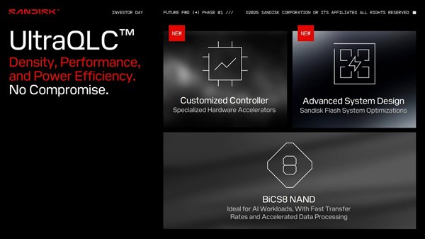 这一目标将通过其UltraQLC技术实现,UltraQLC并非一种新型内存,而是闪迪自家研发的BICS 8 QLC 3D NAND、一个高端专用控制器(支持64个NAND通道)和固件的结合体。