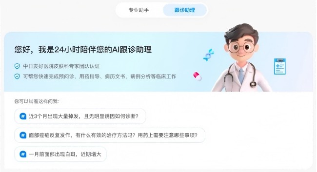 此次,面向皮肤科的 “樱智•α 专病大模型” 率先落地,融入皮肤病专业数据,切实为医生临床工作赋能。基于 “樱智•α 专病大模型”,北电数智与中日友好医院还同步打造了多个智能体助手应用,覆盖助诊、助研等场景,为医生诊疗与科研工作提供全方位支持。