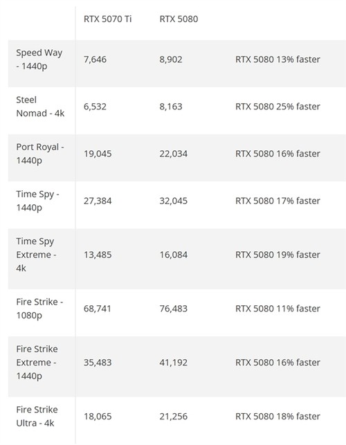 首先,从性能上来看,RTX 5070 Ti在所有3DMark基准测试中,表现不俗。虽然与RTX 5080相比,其速度慢了11%到25%,平均慢了约17%,但与上一代RTX 4070 Ti Super相比,RTX 5070 Ti则平均快了16.6%。这显示了NVIDIA在显卡性能优化上的精准“刀法”。