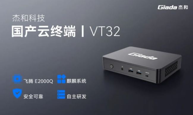 杰和科技推出的云终端VT32,以飞腾腾珑E2000Q处理器+银河麒麟系统为核心,为政府、金融、能源、医疗等关键行业提供安全、高效、易管理的国产化桌面云终端方案,助力构建自主可控的IT基础设施。
