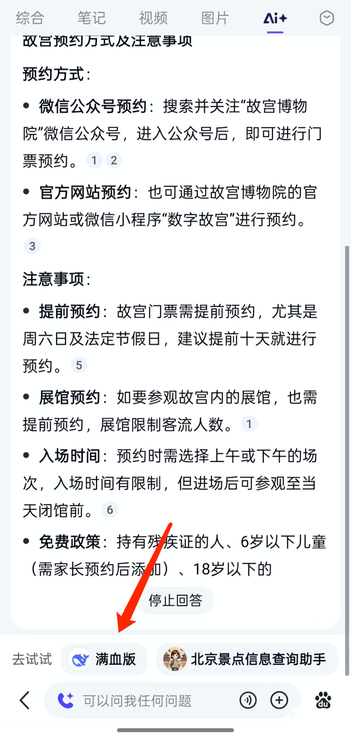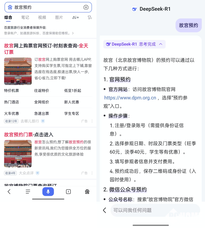 我们抛给百度App一个“故宫预约”的问题,结果百度官方的搜索页面全是广告,调用DeepSeek-R1满血版后,则可以给出准确的反馈。由此来看,DeepSeek-R1满血版相较传统搜索引擎,确实比较优势明显。