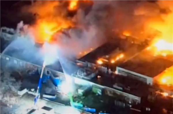 航拍视频显示,工厂屋顶冒出大量烟雾,后大火喷射而出,整个厂房几乎都被笼罩,场景骇人。