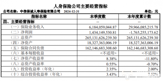 值得一提的是,据中信保诚人寿公布的2024年第四季度偿付能力报告显示,2024年公司累计保险业务收入约为299.66亿元,与上年同期的315.82亿元相比缩减;公司2024年净亏损17.65亿元。此外,据天眼查显示,中信保诚人寿在2023年也是亏损状态,共计亏损7.96亿元,两年净亏损金额超25亿元。