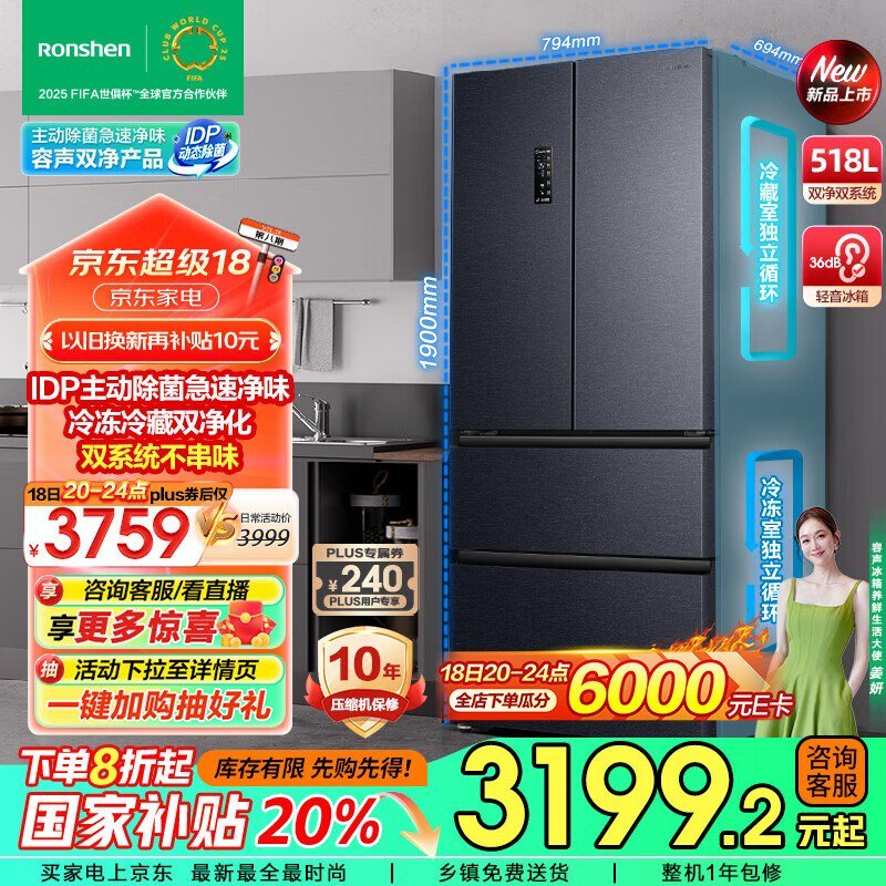 容声 BCD-518WD15MPA 法式多门冰箱:智能除菌 一级能效 双净双系统
