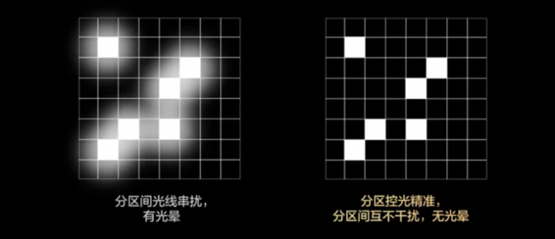 首先,导致光晕现象的根本原因就是电视背光分区控制不精准所导致的,这句话如果有点抽象,那么我们可以打个比方,MiniLED的背光分区可以看作是一个个配有独立灯光开关的房间,光晕就仿佛是明亮的房间所产生的光不小心串到了黑暗的房间,以至于原本没开灯的房间无法全黑,而表现在画面上就是发光物体边缘蔓延出来的虚影,非常影响观影体验!
