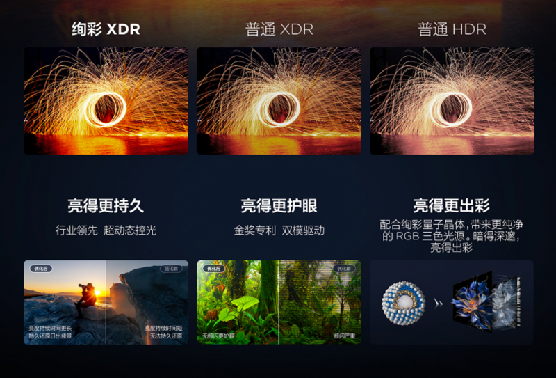 此外,这款电视所搭载的另外一项黑科技——绚彩XDR峰值亮度也是它能成为“2025真香MiniLED神机”的关键。了解到,由于采用了超动态控光技术,因此,C11K的峰值亮度不同于普通电视的瞬时峰值亮度,亮一下就马上衰弱,绚彩XDR可以长时间稳定输出,避免忽明忽暗的情况,最适合看类似于日出、打铁花之类长时间高亮的影片。另外得益于双模驱动技术,使得亮度可以智能调控,更加护眼,并且过去电视看高亮画面会出现亮度越高画面越泛白的情况,而绚彩量子晶体就很好地解决了这一问题,让亮度呈现时刻都那么出彩!