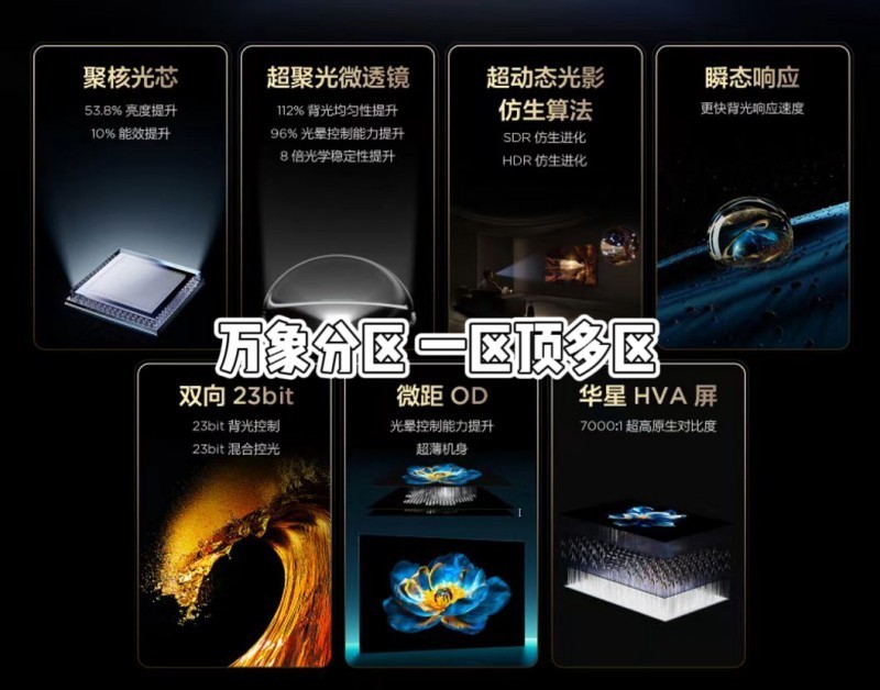 要知道,从背光到成像的全链路其实都影响着控光的精准性,包括发光芯片、聚光透镜、OD技术、控光算法等,这也是为何当普通分区数到达一定数量后光是增加数量是不够有效的原因,而万象分区所应用的万象光晕控制技术之所以厉害,就是因为它采用先进的聚核光芯、超聚光微透镜、微距OD、瞬态响应、双向23bit、超动态仿生控光算法以及自研的高端华星HVA屏,在强悍的软硬件配合下,从而进行了系统性、全链路的精准控光,万象分区也就有了比普通分区强数倍的控光能力!