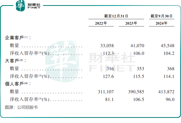 2022年底至2024年9月底,公司企业客户数目由33,058名增加45,548名,个人客户数目311,107名增加至413,872名。此外,企业客户净收入留存率表现优异,2024年9月底达104.2%,个人客户净收入留存率则为96.0%。