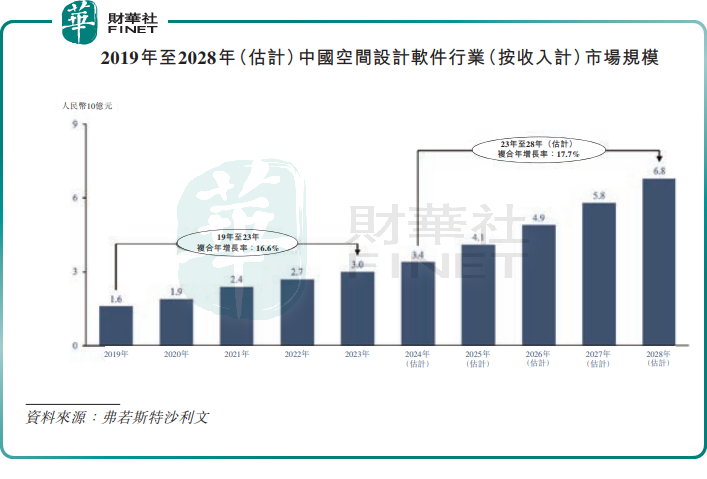 数据显示,中国空间设计软件行业规模由2019年的16亿元(单位人民币,下同)增长至2023年的30亿元,复合年增长率为16.6%。预计到2028年将进一步增加至68亿元,2023年至2028年的复合年增长率为17.7%。