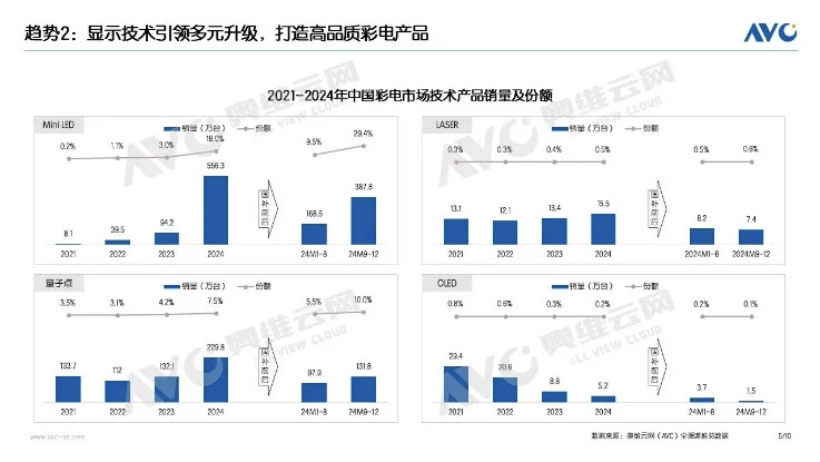 事实也的确如此,根据奥维云网(AVC)最新数据显示,2024年中国彩电MiniLED市场销量规模达到了556万台,占了整体彩电市场的18.0%,跟去年同期比起来,销量份额大幅增长了15个百分点。