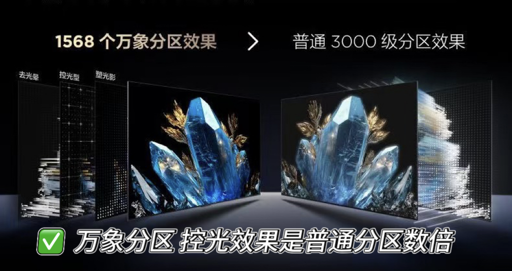 可能有人会好奇,万象分区究竟有什么特别之处?其实,万象分区技术通过聚核光芯、聚光微透镜、微距OD、光影控制算法以及屏幕全方位升级优化,能够有效攻克电视光晕难题,实现了画质的重大突破,控光效果更是普通分区的数倍。以85吋的C11K电视为例,它配备了1568个万象分区,实际效果远超拥有3000 级普通分区的电视。