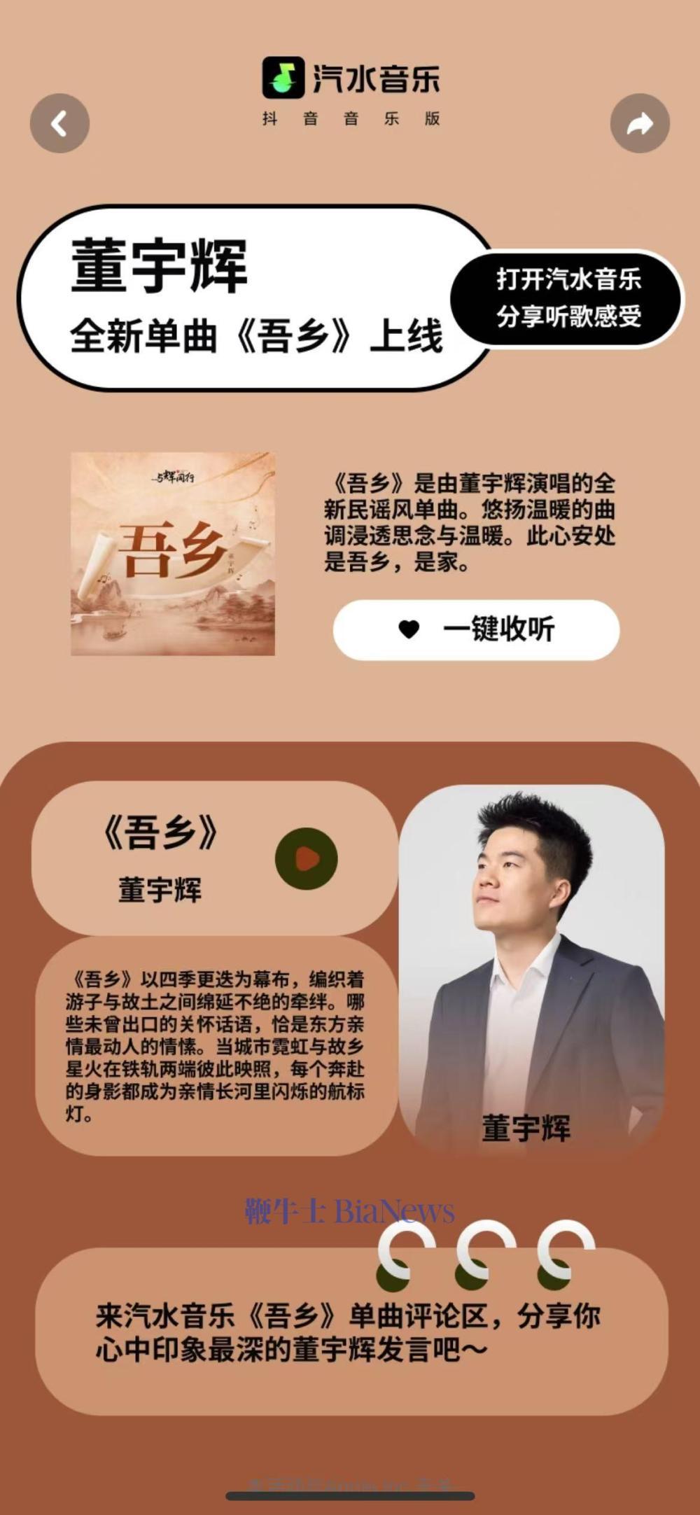 鞭牛士 2月18日消息,今日,董宇辉个人首支单曲《吾乡》正式上线。