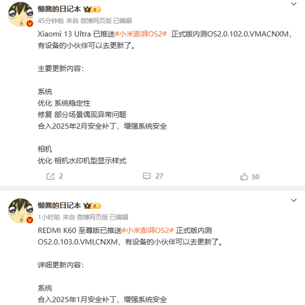 而小米13 Ultra则推出了版本号为OS2.0.102.0.VMACNXM的更新。除了系统稳定性得到了进一步优化,并修复了一些偶尔出现的问题外,相机水印的显示样式也做了改进,使得拍照分享变得更加有趣。同样地,这个版本也集成了2025年2月的安全补丁,确保最高级别的安全防护。