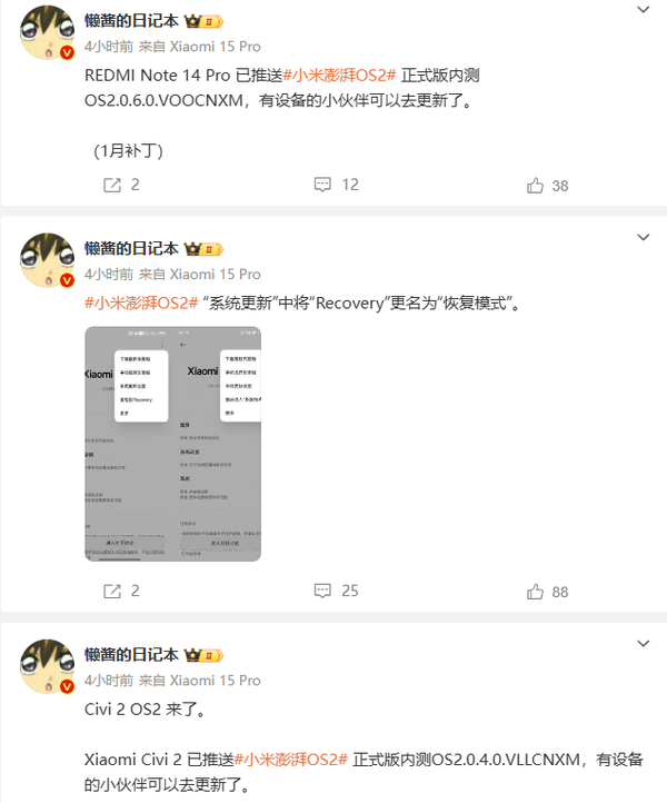 小米Civi 2推送的澎湃OS 2正式版内测版本号为OS2.0.4.0.VLLCNXM。REDMI Note 14 Pro也迎来了澎湃OS 2的正式版内测,版本号是OS2.0.6.0.VOOCNXM。对于REDMI K60至尊版的用户而言,这次的更新版本号为OS2.0.103.0.VMLCNXM。值得一提的是,此次更新中包含了2025年1月的安全补丁,这无疑是对设备安全性的一次重大提升。