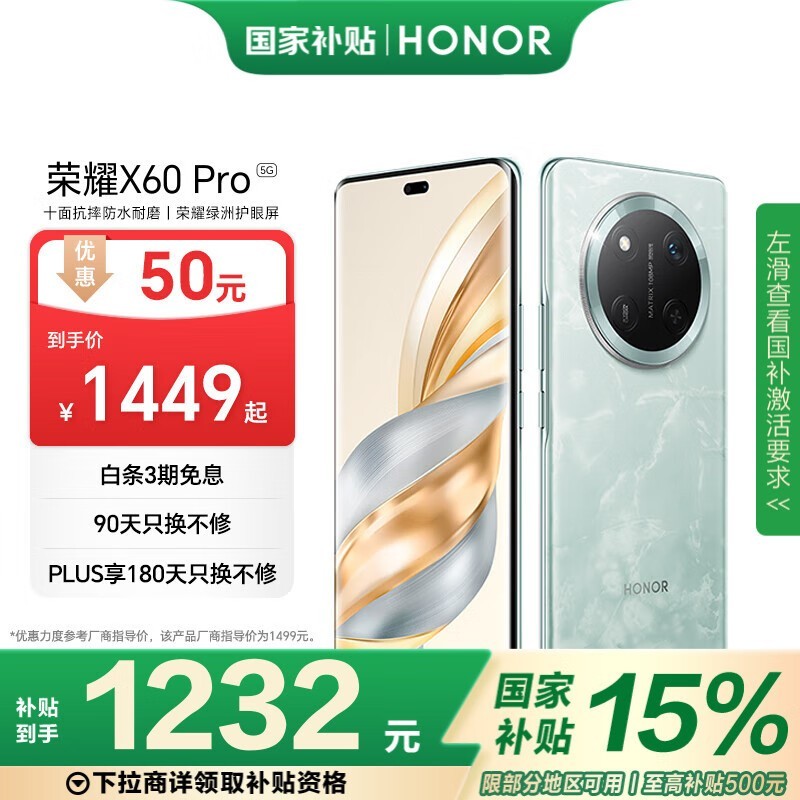 荣耀 X60 Pro手机补贴价1232元 8+128GB天海青版限时优惠
