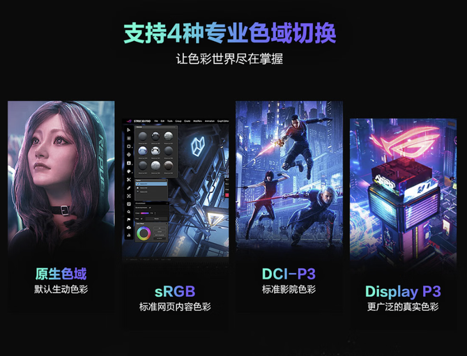更值得一提的是,这块屏幕拥有180Hz的高刷新率,500nits的亮度以及100% DCI-P3广色域覆盖,使得显示的画面细腻流畅、明亮且色彩饱满。为了满足不同用户群体的需求,ROG 幻X 2025 还贴心地提供了4种色域模式的切换功能,无论是绘图设计还是日常娱乐,都能找到最适合自己的显示模式。