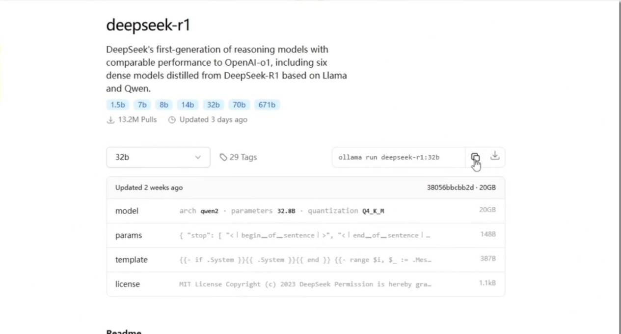3、打开ollama并找到deepseek 模型,选择想要安装的版本,并且复制相关的命令行