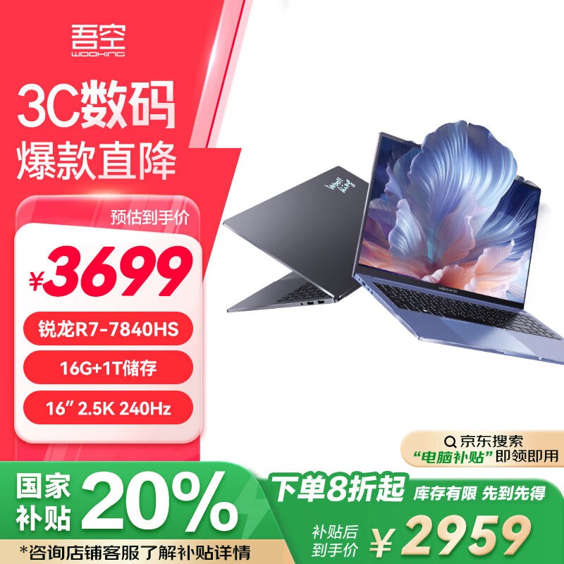 吾空凌云X16锐龙R7-7840Hs 16英寸轻薄本仅2928元