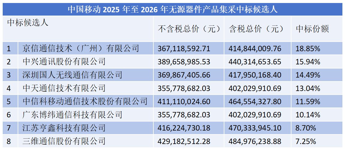 C114讯 2月19日消息(九九)中国移动采购与招标网日前发布2025年至2026年无源器件产品集中采购项目中标候选人公示,京信通信、中兴通讯等8厂商中标。