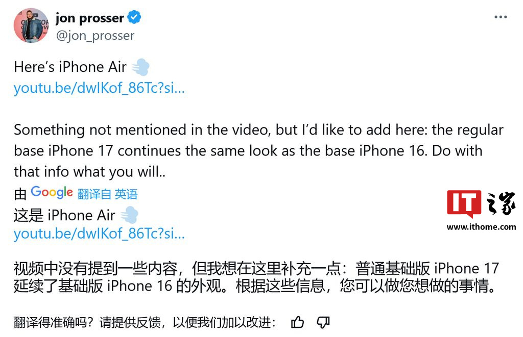 YouTube 频道 Front Page Tech 主播 Jon Prosser 在曝光 iPhone 17 Pro和 iPhone 17 Air渲染图后,昨日在 X 平台发布推文,透露苹果 iPhone 17标准版将沿用旧款设计,意味着今年 iPhone17 系列会有 3 种设计方案。