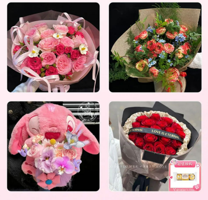 此外,相较于去年,商家对于创意设计款花束的备货比例及平台销售大幅增长。基于对节日热销品类的历史数据挖掘,以及“鲜花+礼物”的一站式消费趋势,美团节前为鲜花商家提供鲜花品类、“鲜花+礼品”(如玩偶、巧克力、皇冠等)的选品指导,为用户消费提供了更多选择。数据显示,玩偶花束及礼品订单量年同比增长120%,创意设计款花束订单量年同比增长超270%,搭售礼物(如巧克力、玩偶、皇冠等)的鲜花套装订单量年同比增长超200%。粉色系创意设计款花束、苹果杰克玫瑰花束、心形花、气球花四类主推花束订单量年同比增长790%。