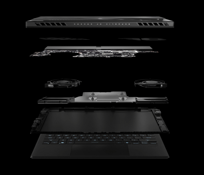 ROG幻X 2025搭载全新冰川散热架构2.0增强版,内置双第二代Arc Flow绝尘风扇,可提升11%气流,采用内吹技术,大幅降低了主板与屏幕温度,提升了整机运行的稳定性与触控操作的手感。配备超大面积复合均温板覆盖大部分主板元器件与CPU供电,SoC处涂抹有暴力熊液金以确保核心热量被快速传导,相比传统硅脂至高降温约13℃。