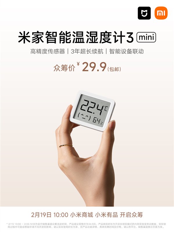 快科技2月19日消息,小米最新推出的米家智能温湿度计3 mini今日开启众筹,29.9元包邮。