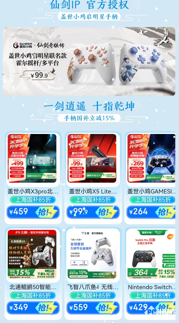 仙剑IP还与盖世小鸡联名推出了一款无线游戏手柄,实用的同时还能提供满满的情绪价值。该款联名手柄采用了小鸡定制款霍尔摇杆零漂移的物理结构让走位输出更灵敏,手柄外观有赵灵儿与李逍遥两款类型可选,京东售价99.9元。此外在活动会场还有北通鲲鹏50无线游戏手柄、飞智八爪鱼4无线游戏手柄等多款手柄可选,上海地区用户可使用国家补贴优惠15%,心动的用户可在京东仙剑世界活动页面一键选购。