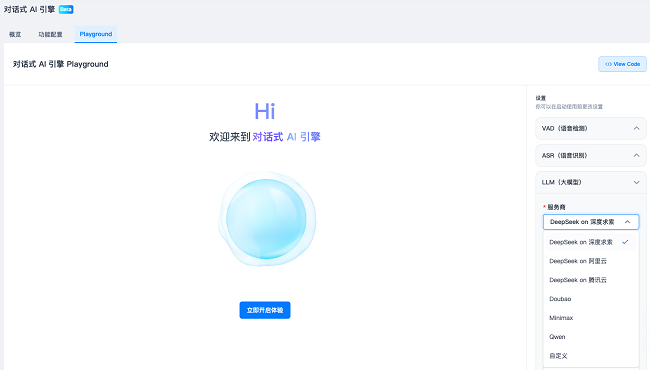 今天,声网对话式 AI 引擎 Beta 版也正式上线,支持开发者在 Console 后台自行开通服务接入 API,并在 Playground 中实际调参、测试并生成代码,仅需2行代码,15分钟即可部署基于大模型的对话式 AI Agent。
