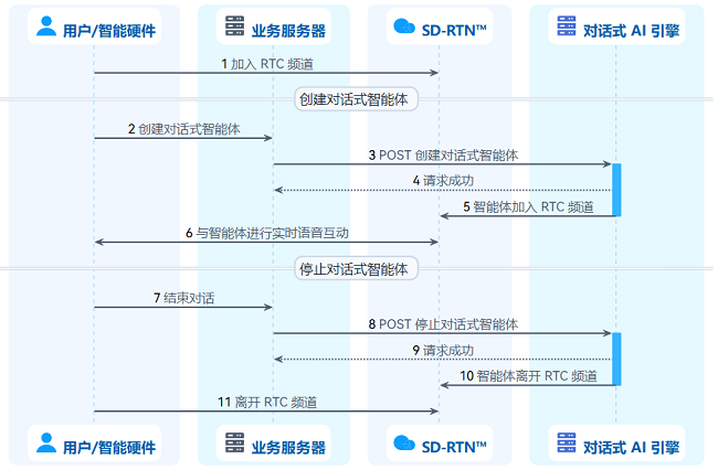 第三步:停止对话式智能体:结束对话后,调用『停止对话式智能体』,让智能体离开 RTC 频道。