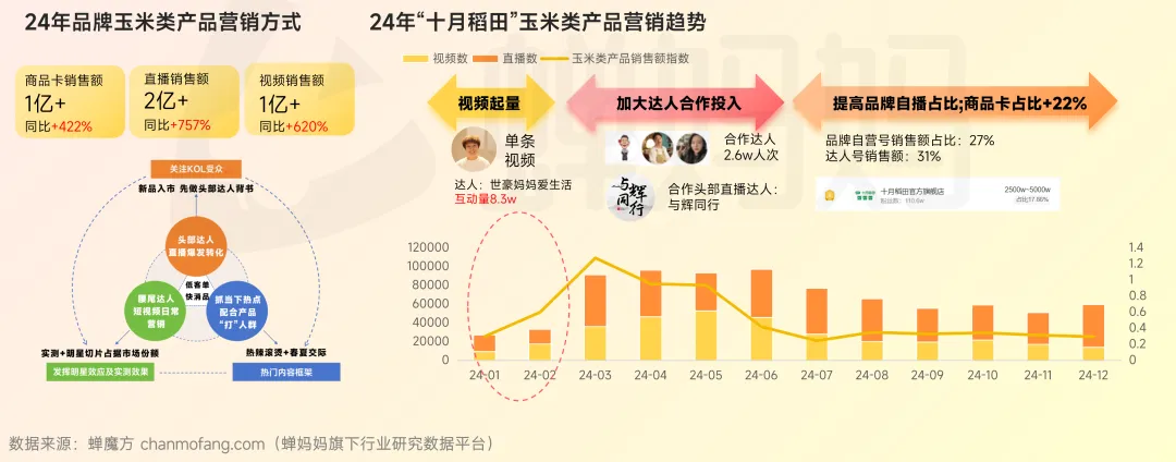 三种销售方式均呈现高同比增长,表明 “十月稻田” 玉米类产品在销售渠道拓展和营销推广上取得成效。直播销售在销售额上领先,视频销售和商品卡销售也贡献了可观的业绩,多种销售方式协同发展,共同推动了产品销售增长。