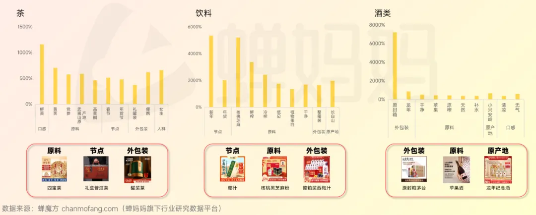 健康原料:茶、饮料和酒类品类中,“鲜爽”“鲜榨”“冷榨”“天然”等关键词销量额显著增长,消费者对饮品的健康属性关注度持续提升。