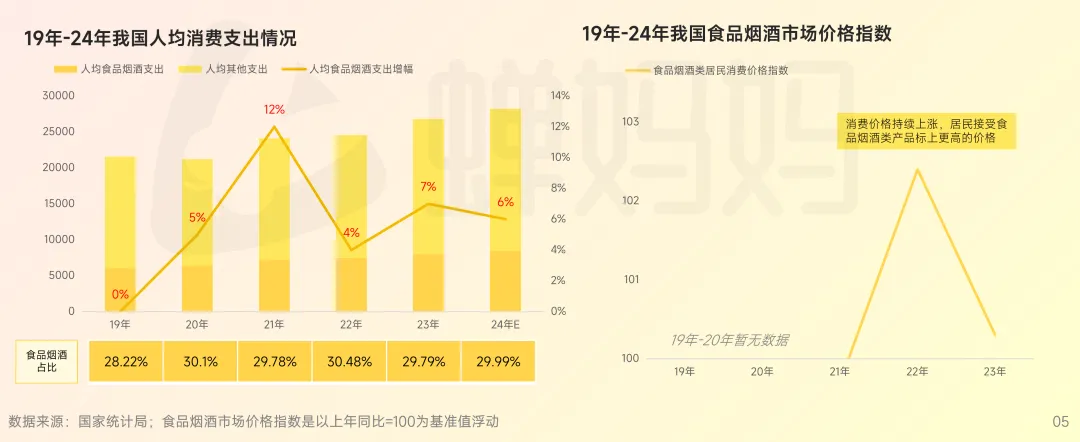 2019年至2024年,我国人均食品烟酒支出占人均消费支出的比例始终稳定保持在28%~30%区间。在此期间,食品饮料行业的支出金额呈现出持续增长的态势。深入探究发现自2021年开始至2023年食品饮料的价格指数上升,但食饮市场的成交额占比依然保持稳定,消费者接受市场为食品烟酒类产品标上更高的价格的。