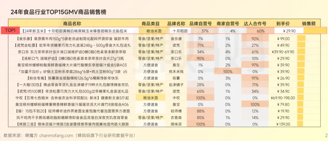 据2024年食品行业GMV前15榜单,热销产品中零食/坚果/特产类占比最多,整体客单价在10-200元之间,标题强调产品口感、产地等信息;销售方式主要为品牌自营。