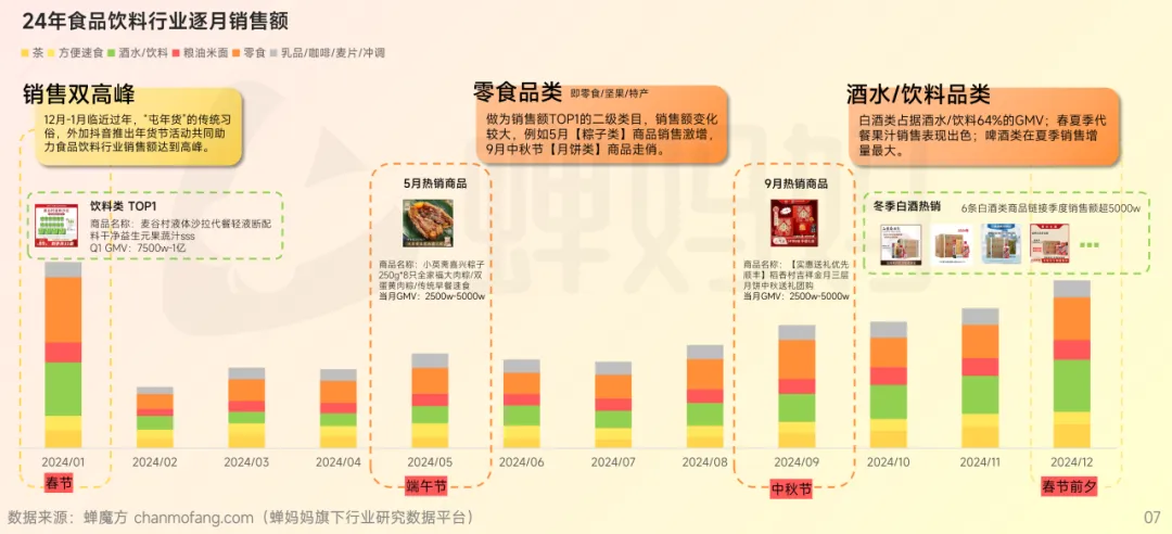 长期以来,我国食品饮料市场保持稳定增长,年消费支出约占我国居民人均消费支出的三成。蝉魔方数据显示,抖音平台食品饮料市场GMV逐年稳定上升,2024年GMV同比增长33%。同时食品饮料行业在节日、大促、季节等场景需求变大。高端化、健康饮食、特色产地等卖点在今年实现销售增长。