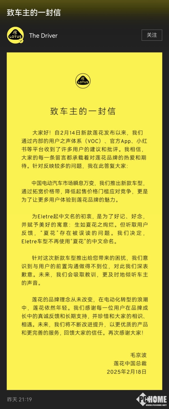2月18日,莲花中国总裁毛京波发布致车主的一封信致歉。信中称,已通过内部用户之声体系(VOC)、官方 App、小红书等平台收到诸多用户建议和批评,意识到在新款车型推出过程中,与用户的前置沟通不到位。同时宣布Eletre车型不再使用 “夏花” 的中文命名。