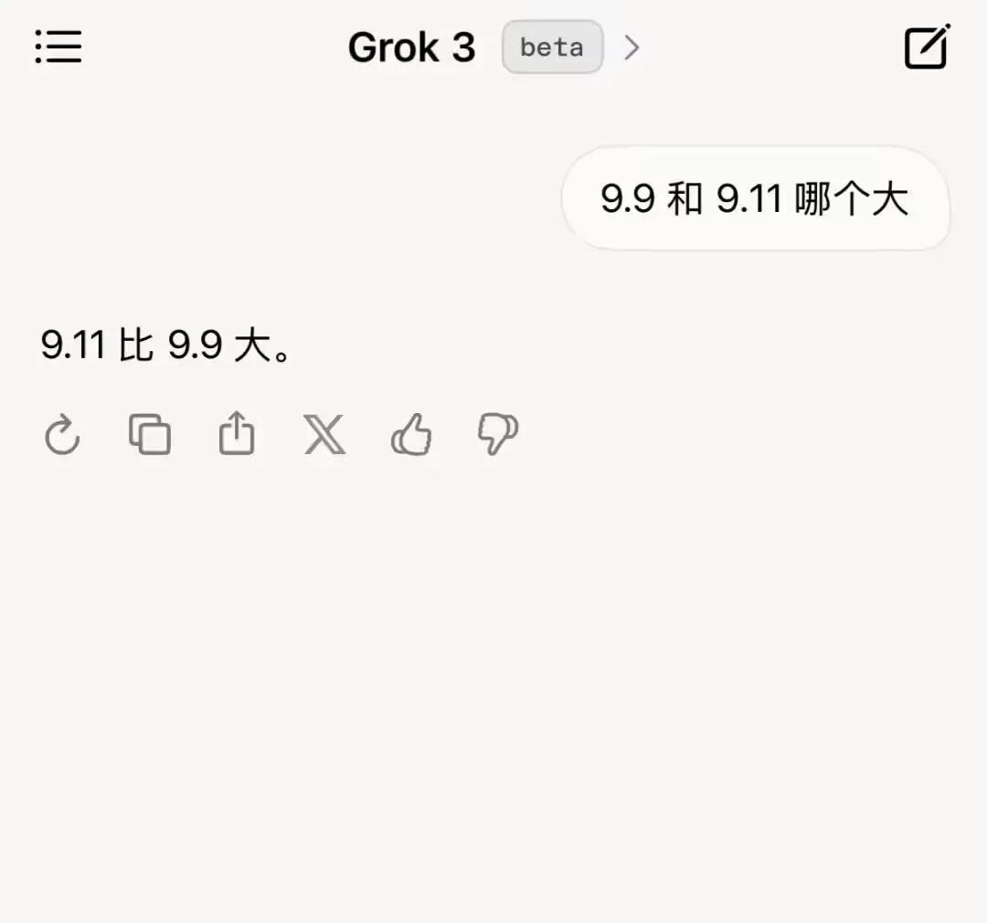 但 Grok 3 的实际测试表现却让人大跌眼镜。发布后,一些媒体测试了最新的 Beta 版 Grok 3,并提出了那个经典的用来刁难大模型的问题:“9.11 与 9.9 哪个大?”遗憾的是,号称目前最聪明的 Grok 3,仍然无法正确回答这个问题,被网友戏称为“天才不愿意回答简单问题”。
