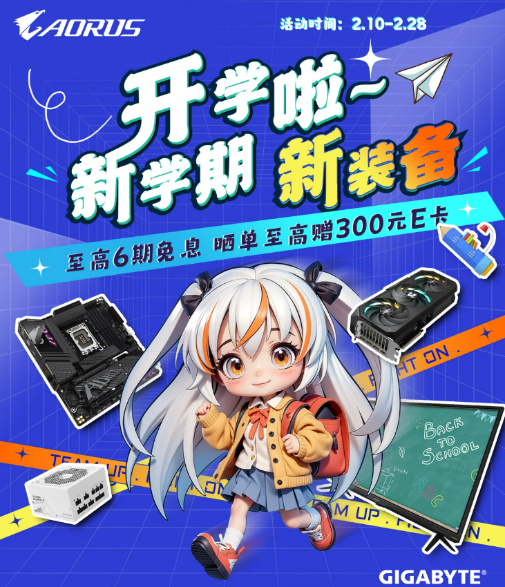 现在参加技嘉开学季活动还可享受至高6期免息,并可获得至高300元京东E卡,具体开学季福利活动如下,最近想要攒机换机升级的用户千万别错个这个好机会,活动时间2月10日-2月28日,千万别错过这开年福利哦。