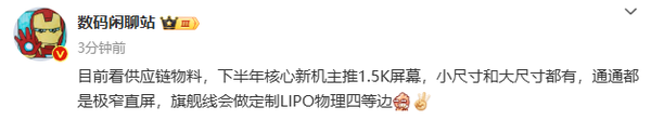 曝2025下半年核心新机将主推1.5K屏幕
