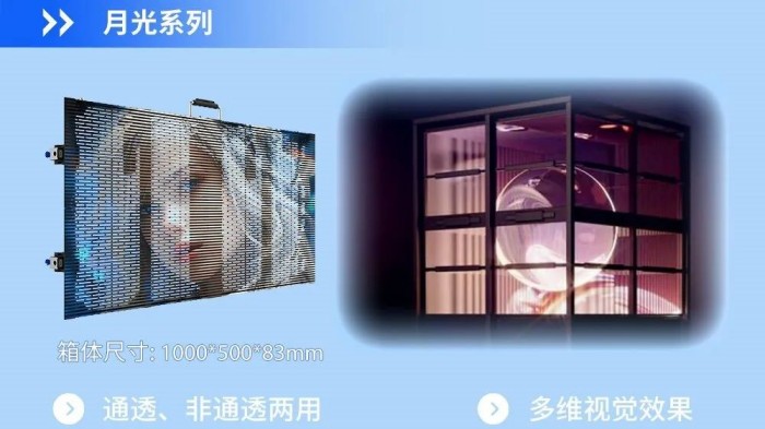 展位上方及左侧方,则以吊装形式展示了新亚胜的另一款明星产品——月光系列。月光系列是一款透明屏产品,可选配遮光板装置,实现通透与非通透两用,该款产品采用压铸铝边框设计,箱体轻薄,吊装高度可达20米,能够为舞台表演带来更多维度的视觉效果。