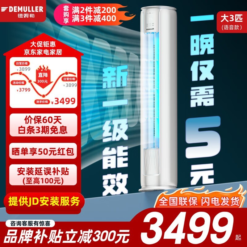 德姆勒DEMULLER立式柜机空调大3匹新一级能效变频冷暖设计