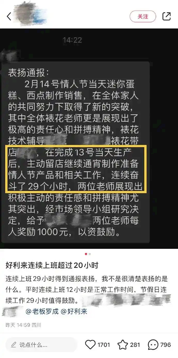 据通报内容显示,一好利来店里的两名员工“主动留店通宵制作准备情人节产品和相关工作,连续奋斗了29个小时,展现出积极主动的责任感和拼搏精神尤其突出,经市场领导小组研究决定,给予每人奖励1000元,以资鼓励。”