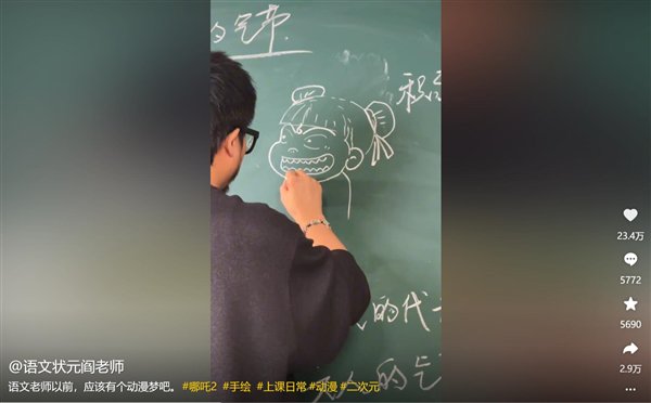 2月19日消息,据媒体报道,一名学生课后给语文老师看《哪吒2》手绘海报,老师“0帧起手”当场粉笔作画,引起学生阵阵惊呼。