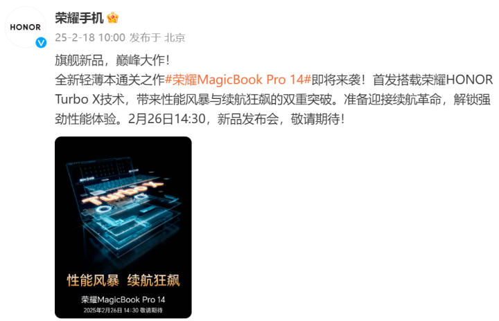 2月18日,荣耀官宣笔记本新品发布会定档2.26,全新轻薄本MagicBook Pro 14将首发搭载新一代底层调校技术 HONOR Turbo X,官方称其为“性能风暴、续航狂飙”。让我们不免对新品笔记本产生了强烈期待。