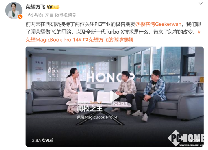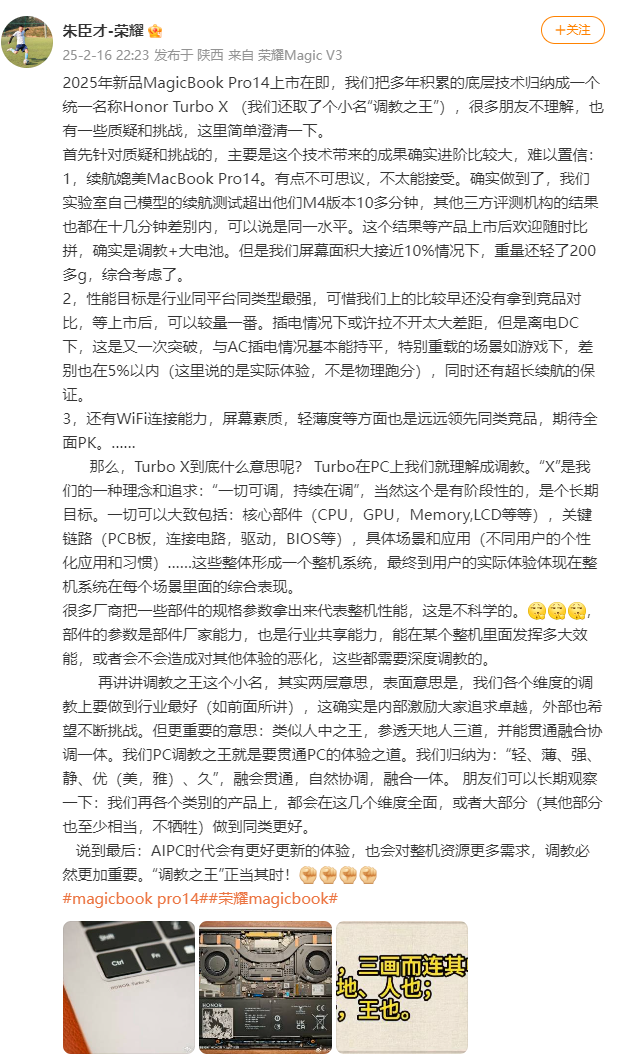 数天前,关于此次升级的Turbo X技术,荣耀 PC 产品线总经理 @朱臣才-荣耀也经发了微博做出解释,他表示荣耀把多年积累的底层技术归纳成一个统一名称Honor Turbo X (小名叫“调教之王”),敢叫做调教之王,那说明肯定是有点东西。