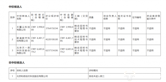 除了上述中标候选人外,还有一个投标人是北京和信创天科技股份有限公司,不过其排名并未进入前三。