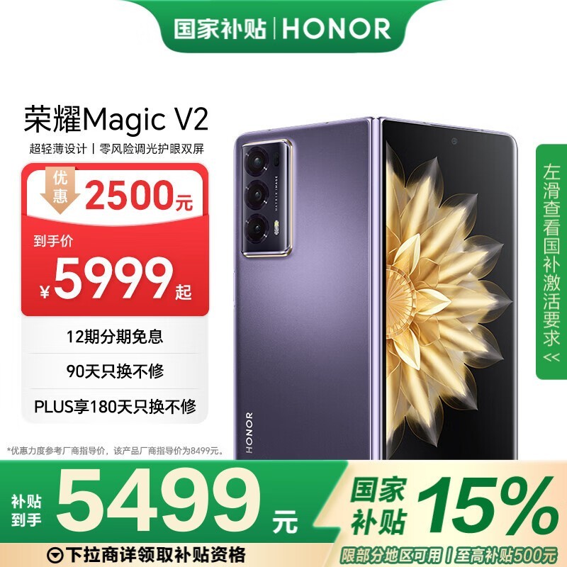荣耀Magic V2折叠屏手机5G绒紫色16GB+512GB京东特惠5169元