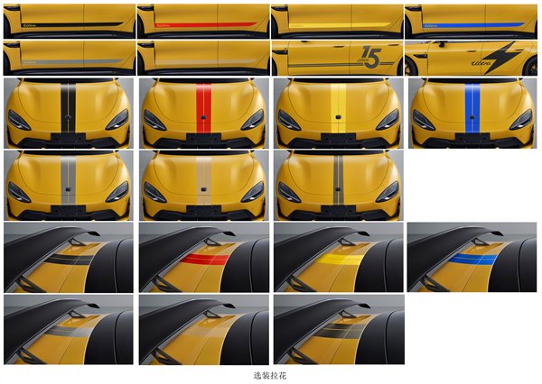 其他方面,小米SU7 Ultra提供了大量选装配件,包括车身拉花、固定式大尾翼、纯金车标、打孔前机盖、多种样式轮毂等。