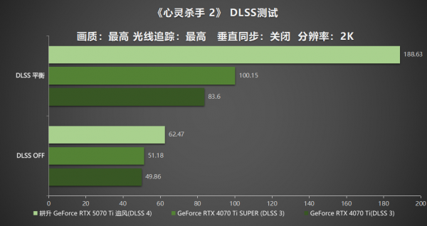 在测试中可以看到,GeForce RTX 4070 Ti SUPER和GeForce RTX 4070 Ti在最高画质、光线追踪开启、DLSS打开时,4K分辨率下两款显卡分别有58.05帧和50.01帧,都有着比较优异的性能。而耕升 GeForce RTX 5070 Ti 追风能够达到121.08帧的高性能。可见《心灵杀手2》在启用DLSS 4后,耕升 GeForce RTX 5070 Ti 追风在4K分辨下的帧数表现,拥有近108%的性能提升。
