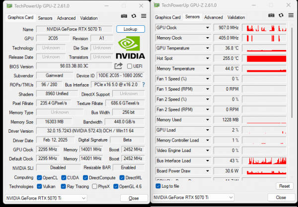 由检测软件GPU-Z可看到耕升 GeForce RTX 5070 Ti 追风更为具体的参数表现和实际规格。通过数据可以看到,在待机状态下,显卡温度为36.8℃,功耗为30.6W。